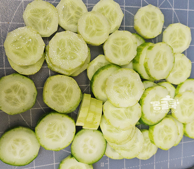 오이는 0.5~0.8cm 정도로 도톰하게 썰어주는 것이 중요해요.