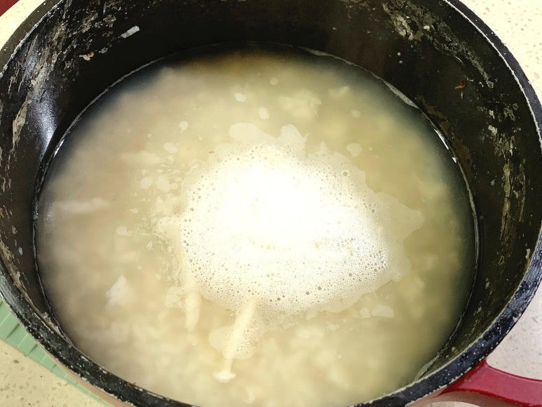 누룽지에 물을 부어 주고는 끓여 줍니다.