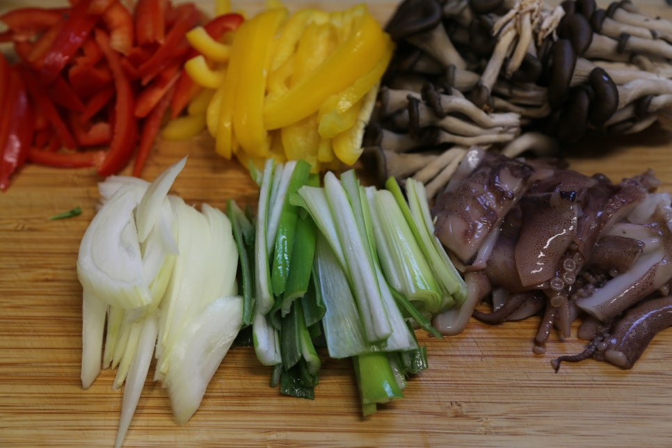 오징어 2마리, 대파 1/2대, 양파 1/2개, 파프리카(노랑, 빨강) 각 1/2개