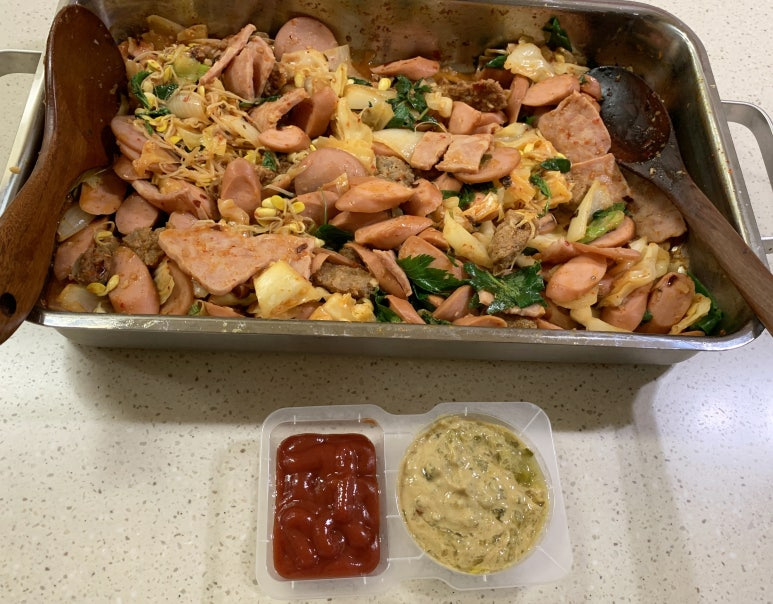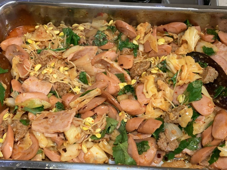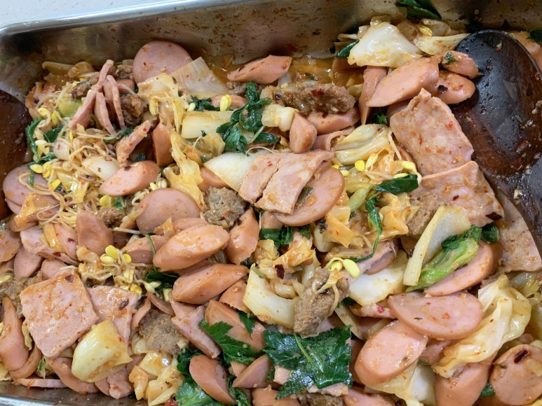 넓은 직사각형 팬에 기름을 두르고 한쪽에는 부대찌개모둠햄을 넣어 주고,