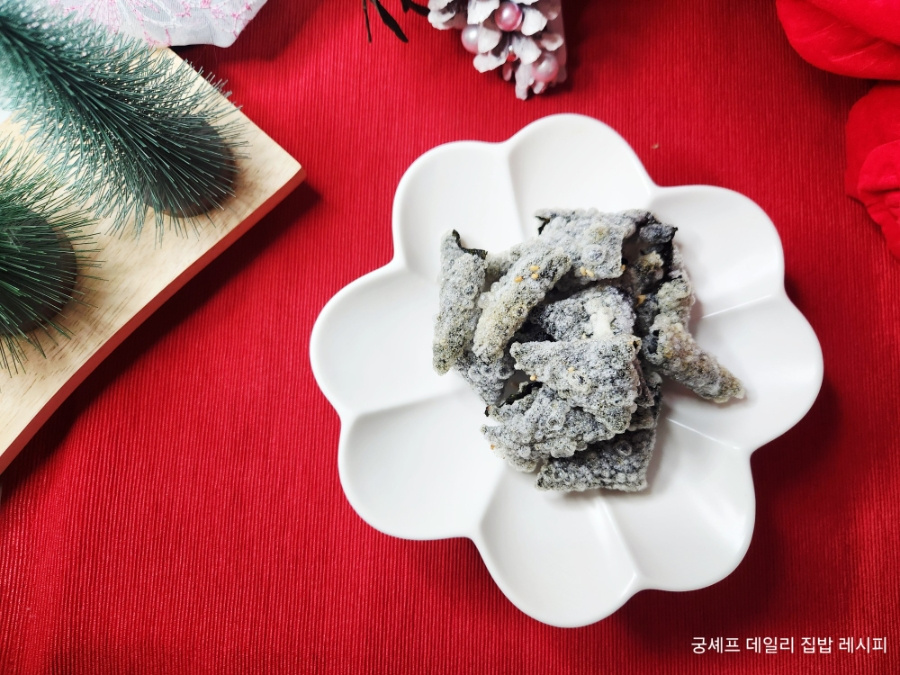 팬에 식용유를 낙낙히 부어주고 예열 시켜 준 뒤, 잘라 놓은 김을 튀겨 주면 김부각은 완성입니다.