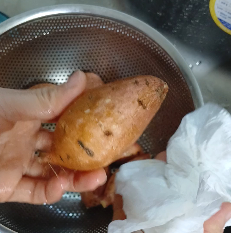 키친타월로 고구마 겉에 묻은 물기를 톡톡 두르려 흡수시켜주세요