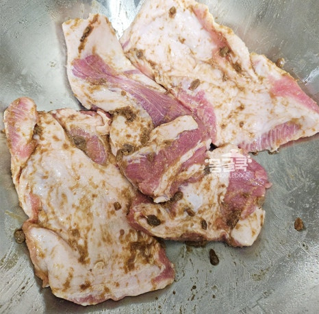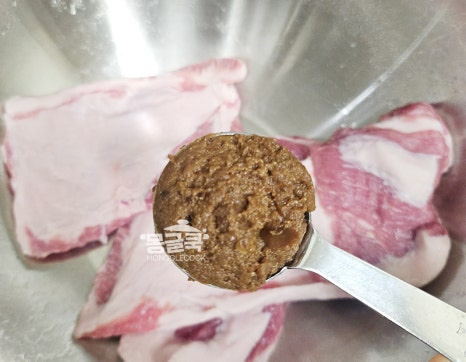 된장 1큰술을 고기 겉면에 골고루 펴 주세요.