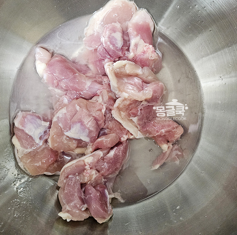 닭다리살은 흐르는 물에 씻어 물기를 제거한 뒤,