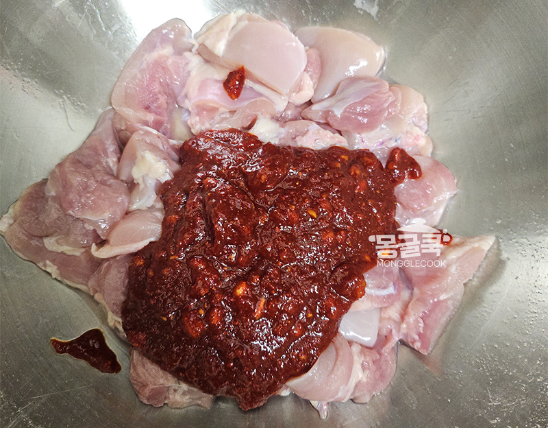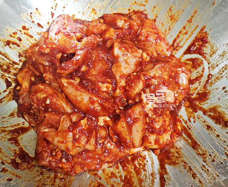 만든 양념장 중 약 2/3만 사용해 닭고기에 골고루 버무려주세요.