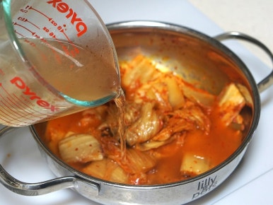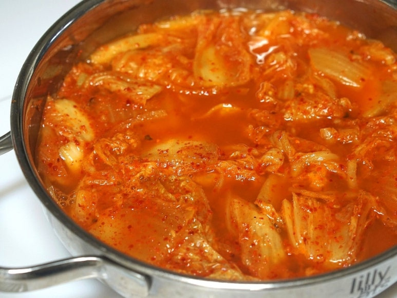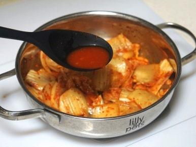 김치가 나른하게 볶아지면 김치국물 1/2국자를 넣고 살짝 볶아준 후 물 450ml를 부어 강불로 끓여주세요. 각 가정마다 김치의 염도가 다르니 김치국물의 양은 조금씩 조절이 필요해요. 김치국물이 졸아들어 타지 않도록 중약불로 줄이고 1~2분 짧게 볶은 후 물을 넣어주세요.