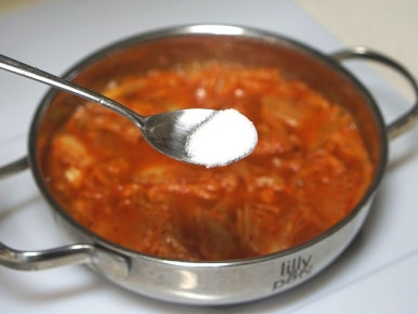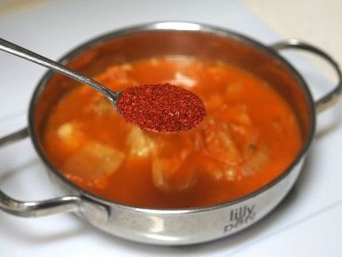 고춧가루 1T로 찌개의 색을 조금 더 진하게 입혀주고, 국물에서 신맛이 느껴진다면 설탕 1/2T로 신맛을 잡아주세요. 그리고 뚜껑 덮어 중약불에서 뭉근히 10분간 끓여주세요.