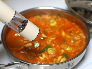 찌개의 간이 입에 맞으면 대파를 넣고 한소끔 끓인 후 불을 끄고 후추 뿌려 마무리해 주세요.