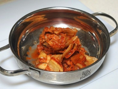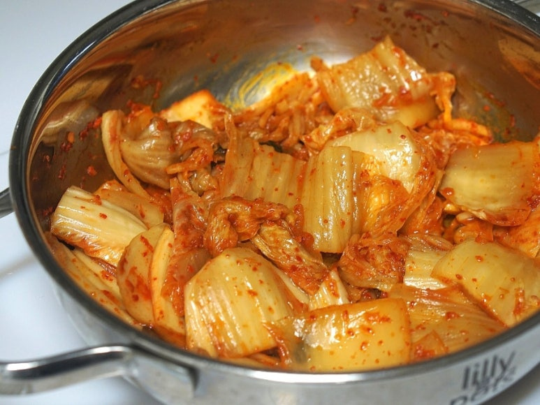 예열된 냄비에 참치기름을 먼저 넣고 김치를 5분간 중불에서 볶아주세요.