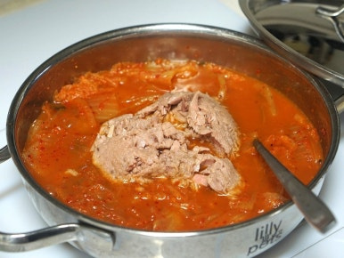 10분 후 참치를 넣어주세요. 그리고 참치가 부서지지 않도록 살짝만 뒤적여준 후 그대로 끓여주세요.