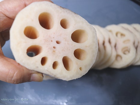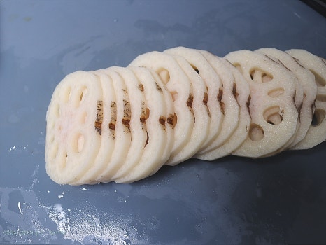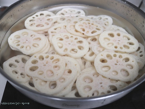 팁: 데치는 과정은 연근의 쓴맛 아린맛을 없애고 아삭한 식감을 살리는 겁니다.