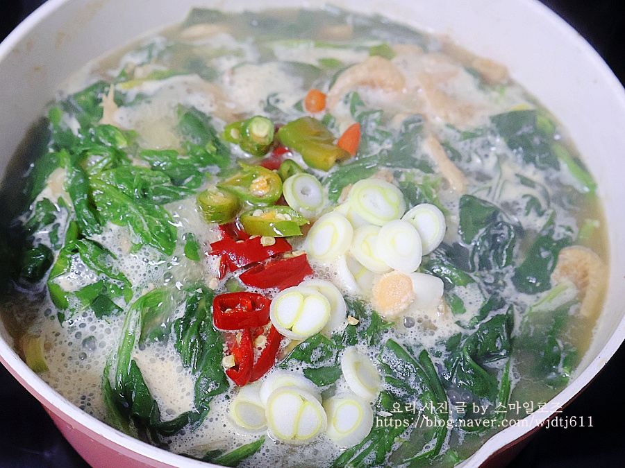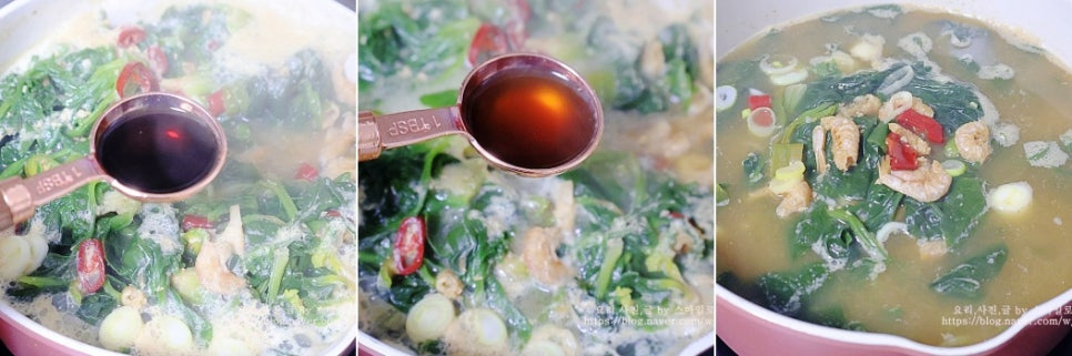 청양고추를 넣어 칼칼한 맛에 뒤끝이 깔끔한 시금치국이 완성되었어요