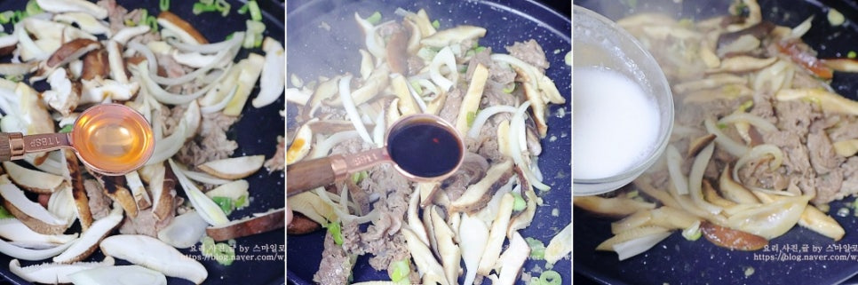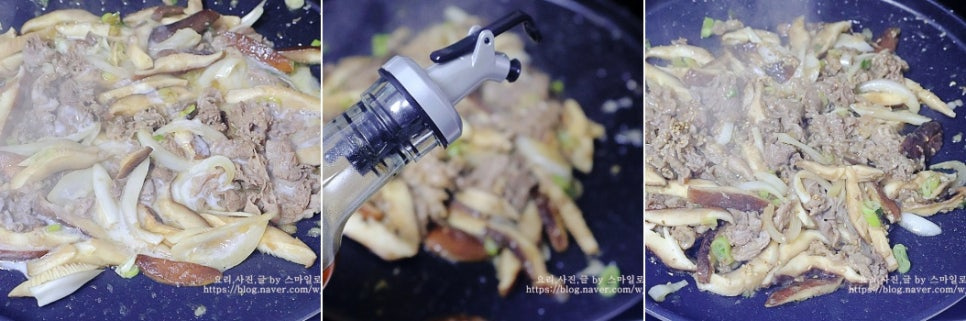 핏물이 살짝 가실 정도로 볶은 후 표고버섯과 양파를 넣어