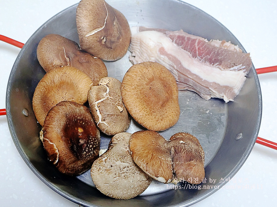 표고버섯만 볶아도 맛있지만 소고기 차돌박이나 우삼겹을 조금 추가하면