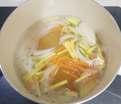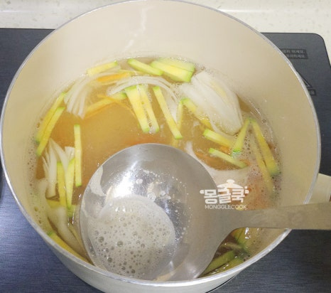 채 썬 양파 → 애호박 → 당근 순으로 넣어주세요.