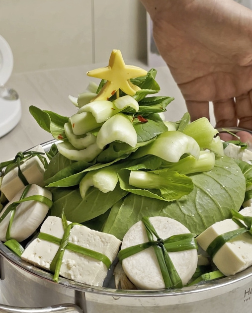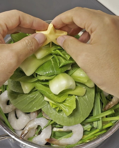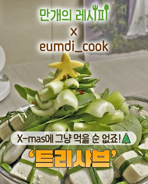 마지막으로 사각 치즈를 두 번 접어 별 모양으로 잘라준 뒤 청경채 위에 나무꼬치를 꽂고 그 위에 치즈를 올려주면 크리스마스 느낌 제대로 나는 샤브샤브 완성입니다!!