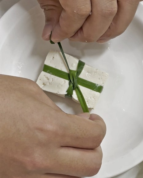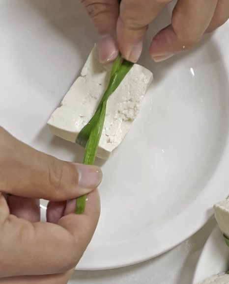 남는 새송이버섯 조각과 두부는 부추의 부드러운 부분을 사용해서 선물 상자처럼 묶어줍니다. 한 방향당 두 번씩 묶어주는 게 포인트예요.