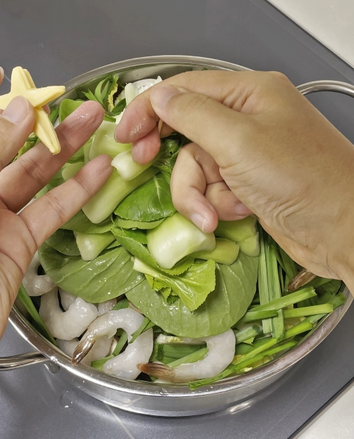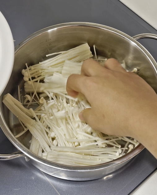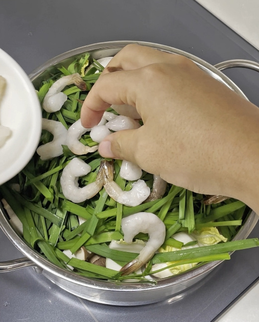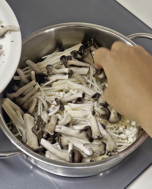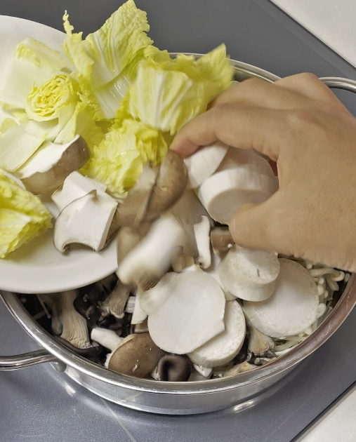팽이버섯, 느타리, 새송이, 배추, 부추, 새우, 청경채를 차곡차곡 순서대로 예쁘게 올려주세요.