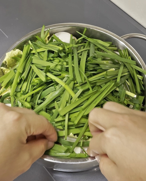 부추는 질긴 부분 말고 연한 윗부분만 사용해야 예쁘게 묶입니다!