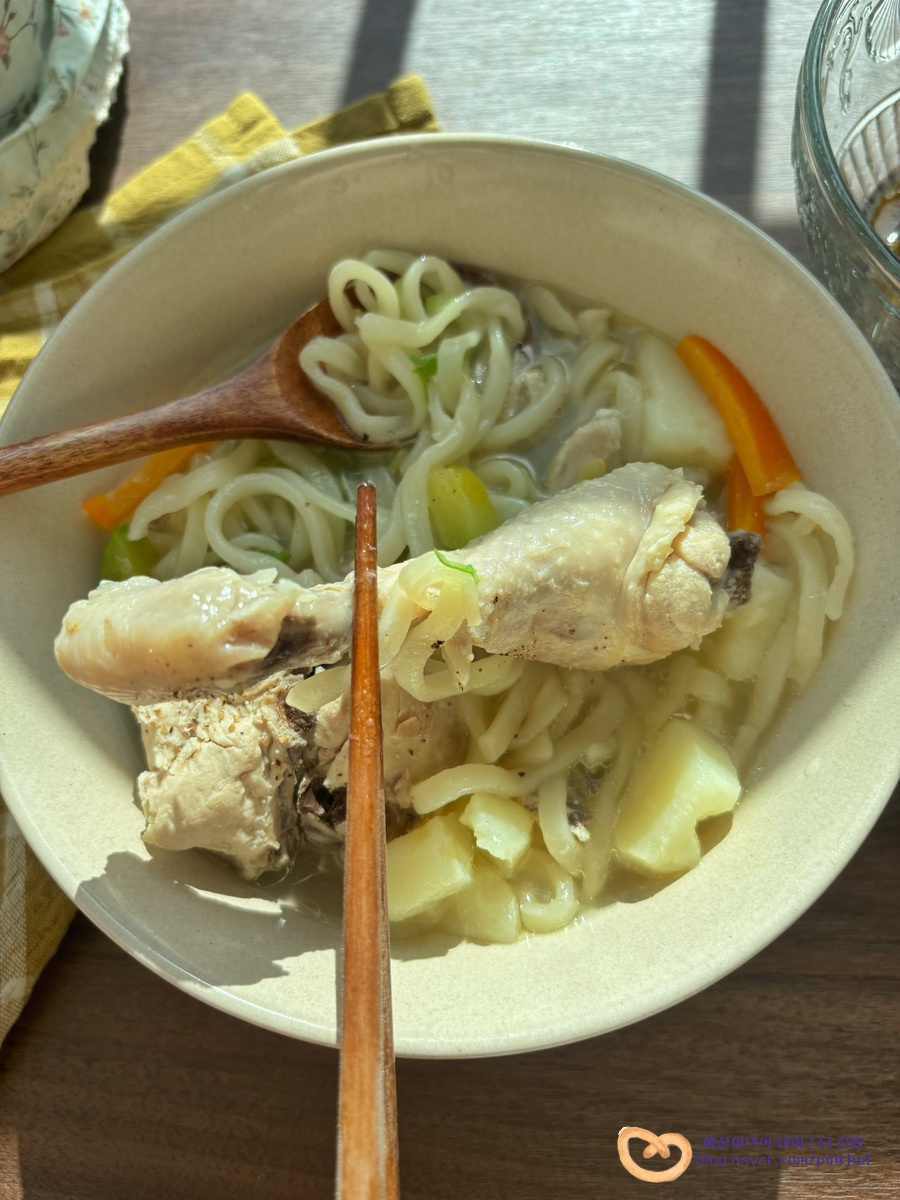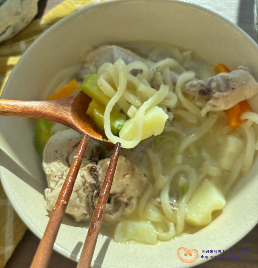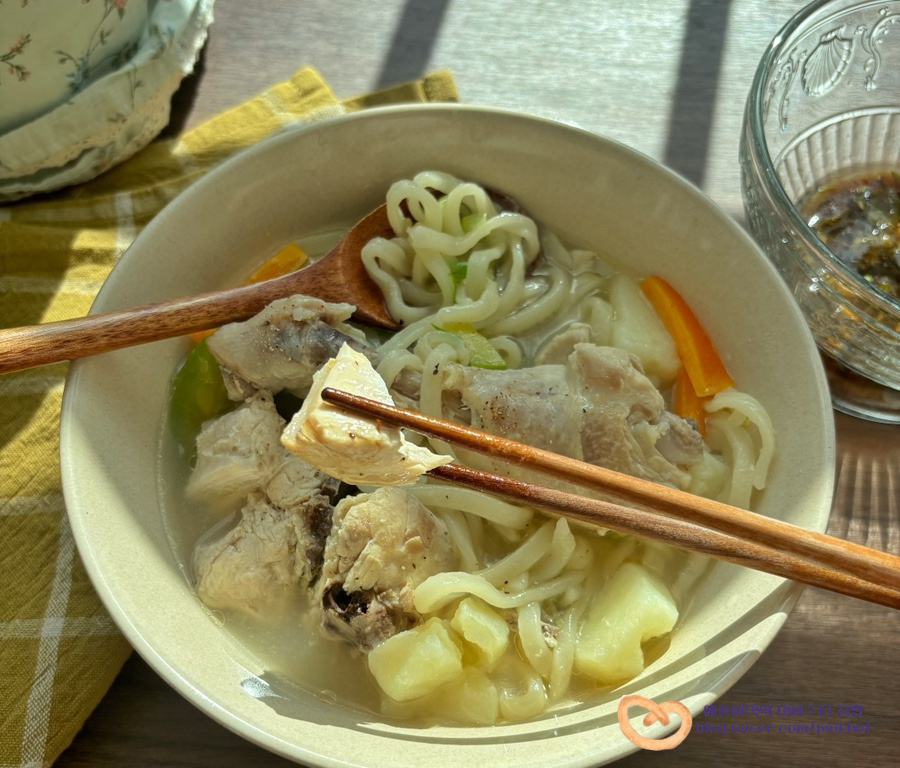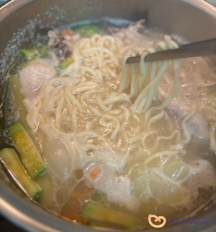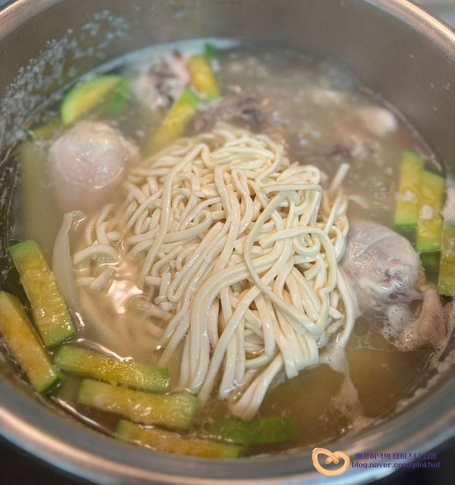 칼국수면은 이 단계에서 넣어주셔도 되고요, 닭고기 먼저 드신 후에 남은 국물에 면을 끓여주셔도 좋아요.