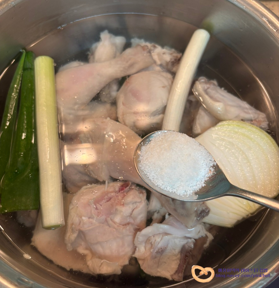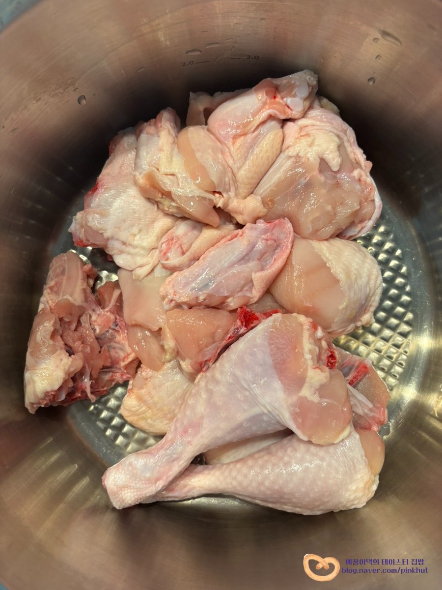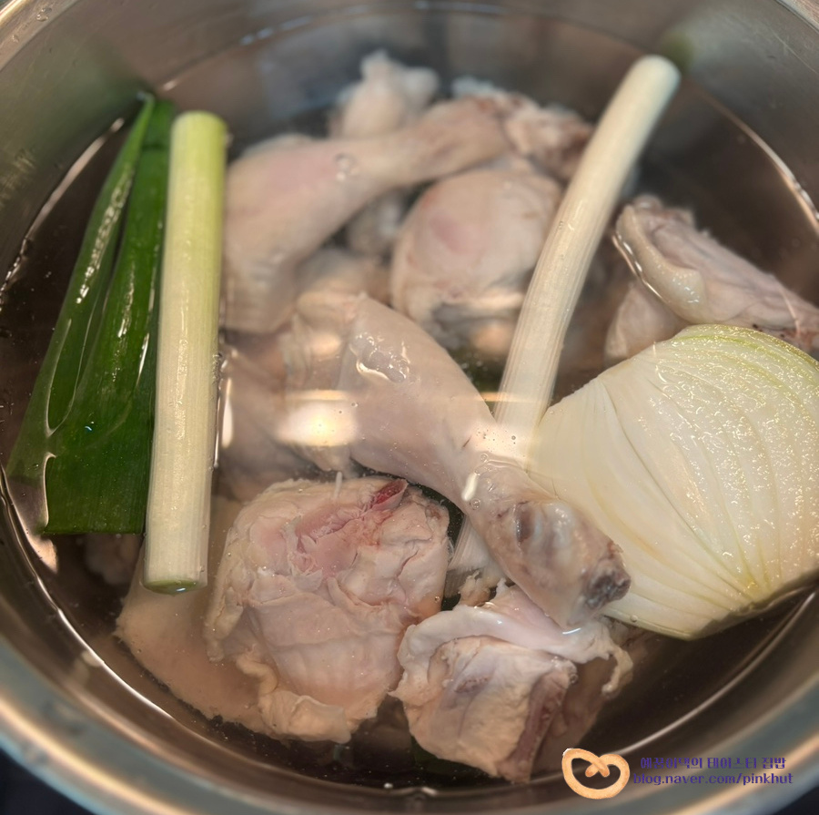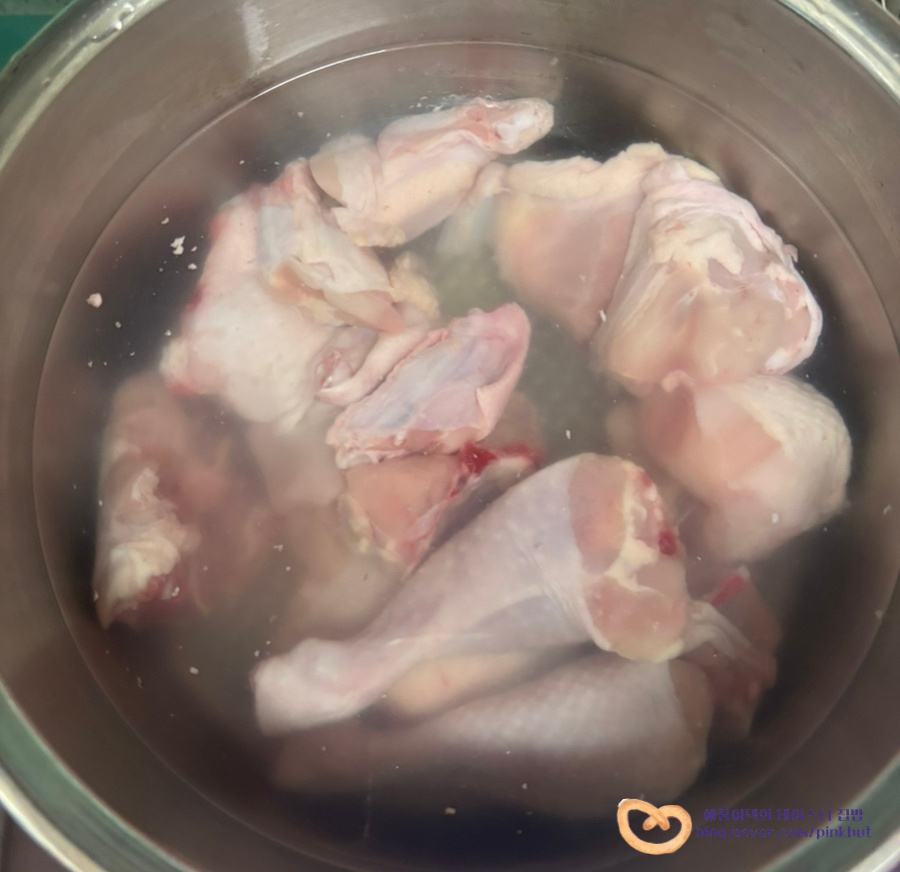 팩에 들어있는 생닭을 그대로 냄비에 털어내고 한번 데쳐줄 거예요
