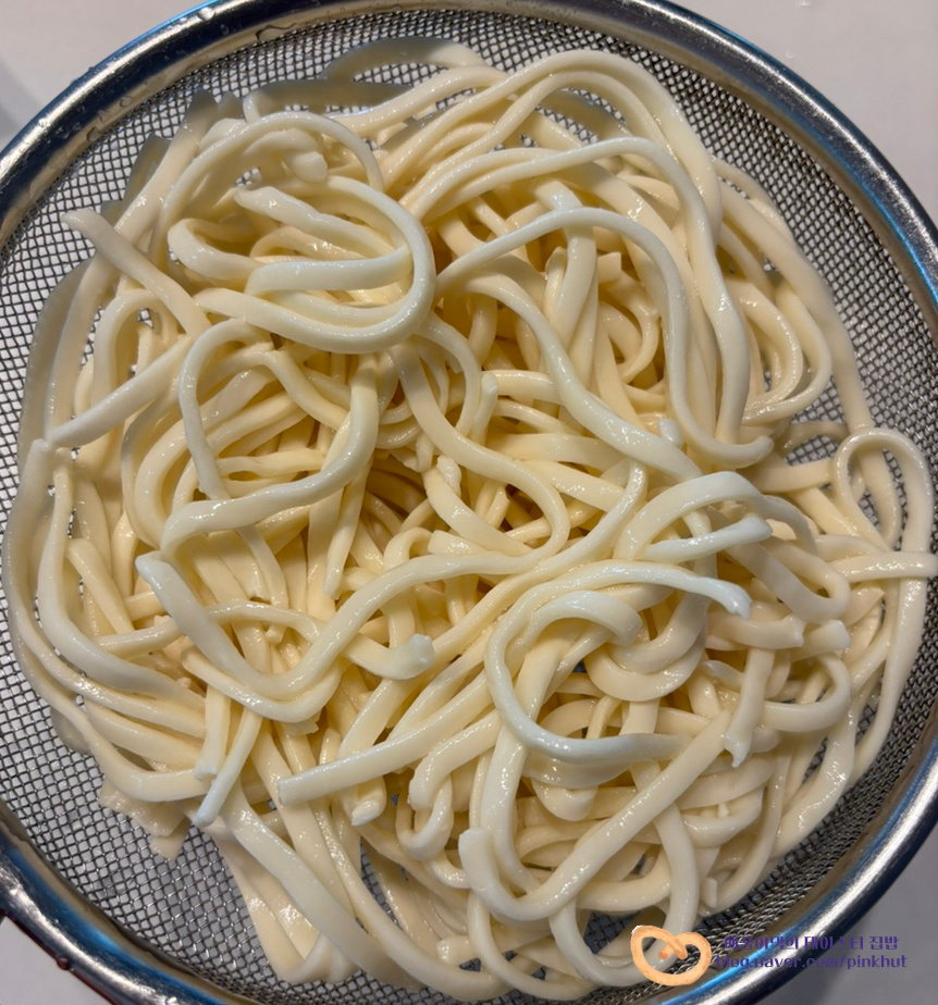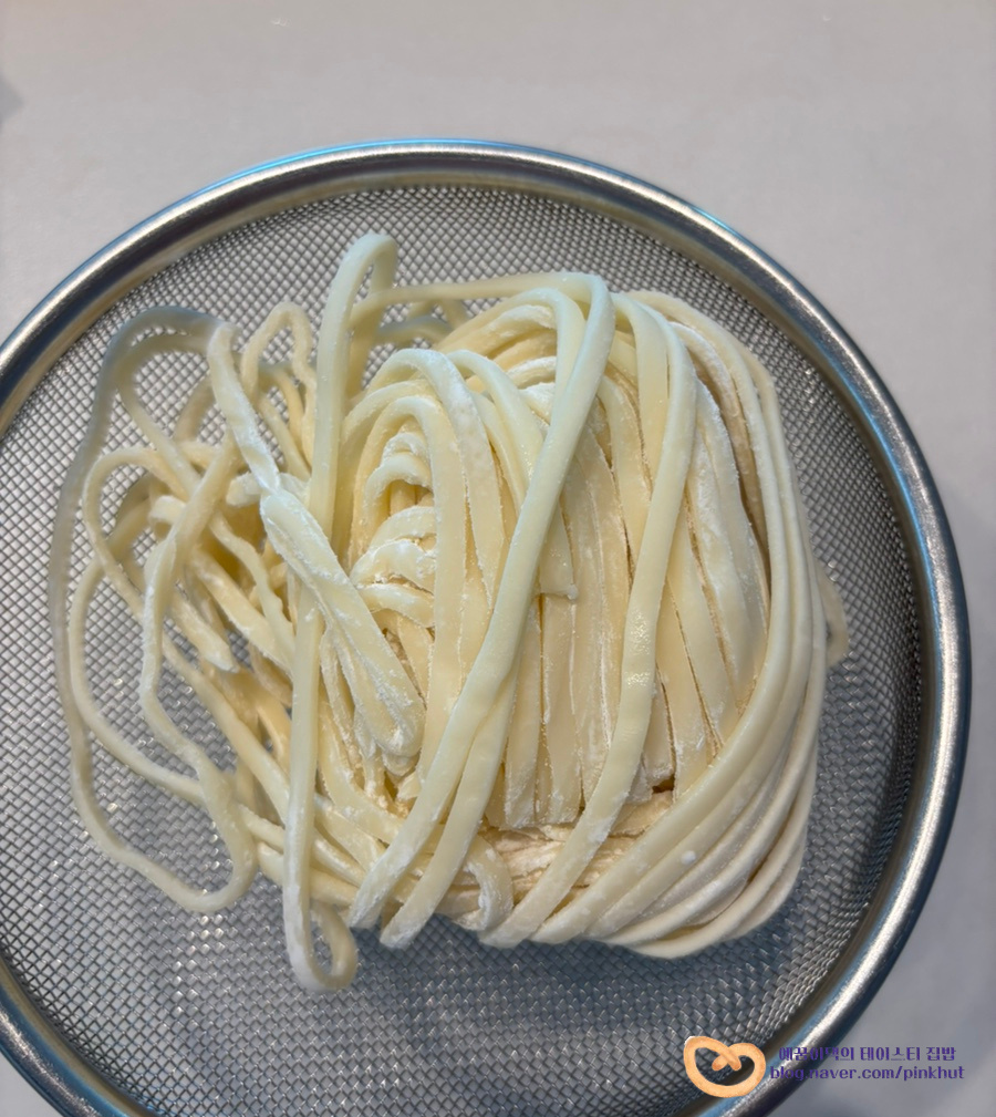 걸쭉한 국물이 싫다 하시는 분들은 흐르는 물에 한번 헹궈서 겉에 묻어있는 밀가루를 제거해 주세요. 면은 닭칼국수 만들기 마지막 단계에서 넣어 줍니다
