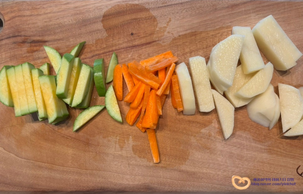 감자 1개와 애호박 1/4개는 먹기 좋고 도톰하게 썰고, 색감을 더해줄 당근은 조금 더 얇게 썰어 준비합니다