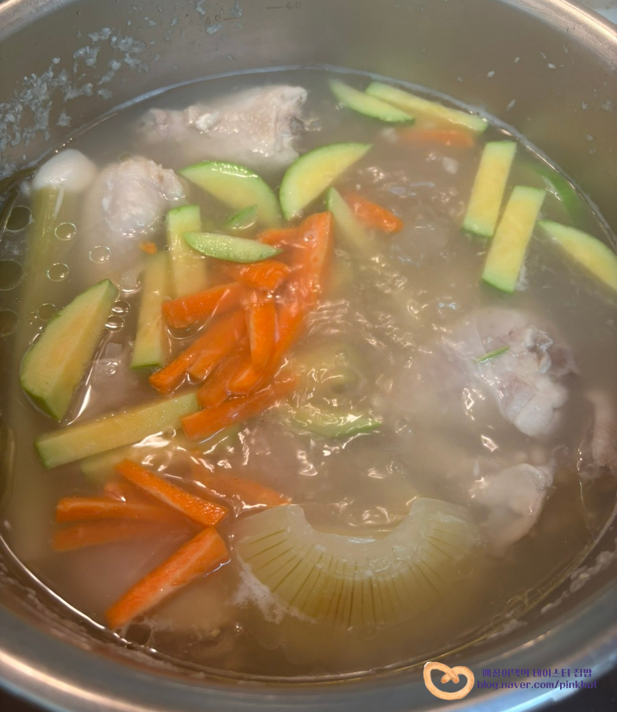 뚜껑을 열어보면 국물이 진하게 우러나와 있을 거예요. 간단하게 닭고기 육수 완성!