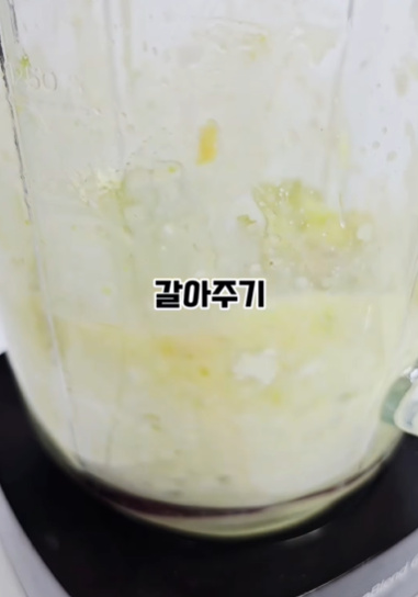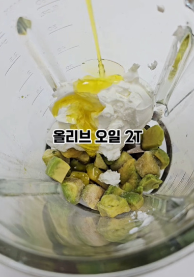 냉동아보카도 1개, 그릭요거트 3T, 레몬즙 1T, 올리브오일 2T, 물 100ml 넣고 갈아줘요.