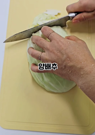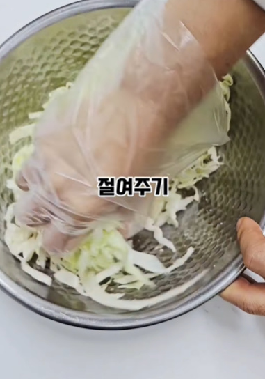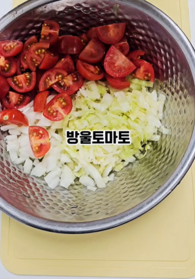 양배추, 양파, 방울토마토를 썰어주고 양배추는 소금으로 바락바락 주물러 절여줘요.