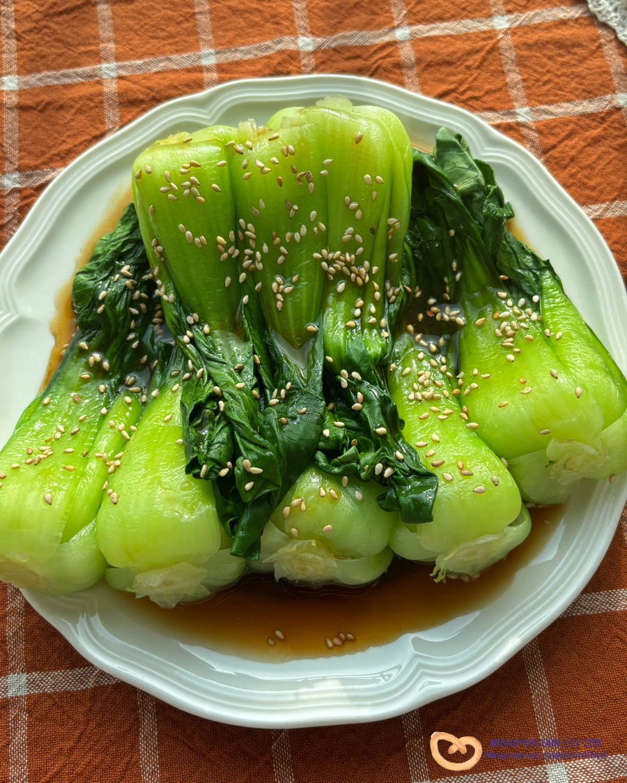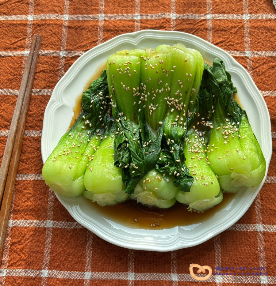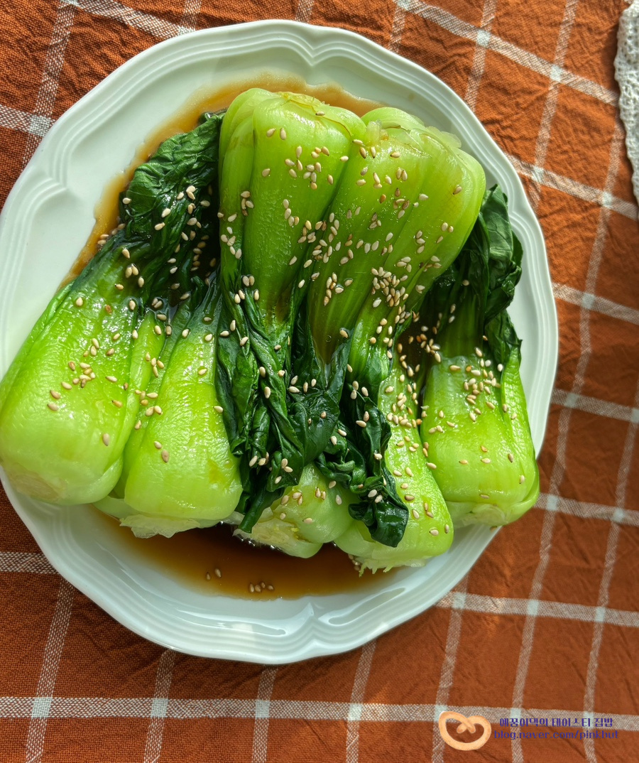 통깨 솔솔 뿌려주면 맛있는 청경채 요리 완성이에요. 포기째로 데쳐내니 비주얼도 너무 예쁘죠?ㅎㅎㅎ