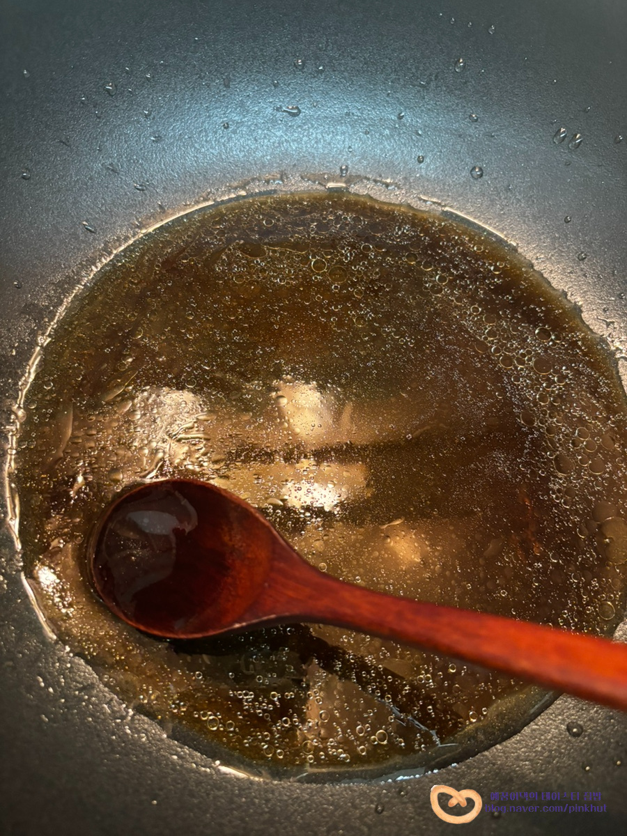 저는 데칠 때 사용했던 웍을 한번 헹궈서 사용했어요. 소스 냄비나 웍에 설탕 1T, 진간장 1T, 참기름 1T, 굴소스 2T, 물 4T 를 넣어주세요. 가루류부터 먼저 넣으면 숟가락 계량하기가 편해요.