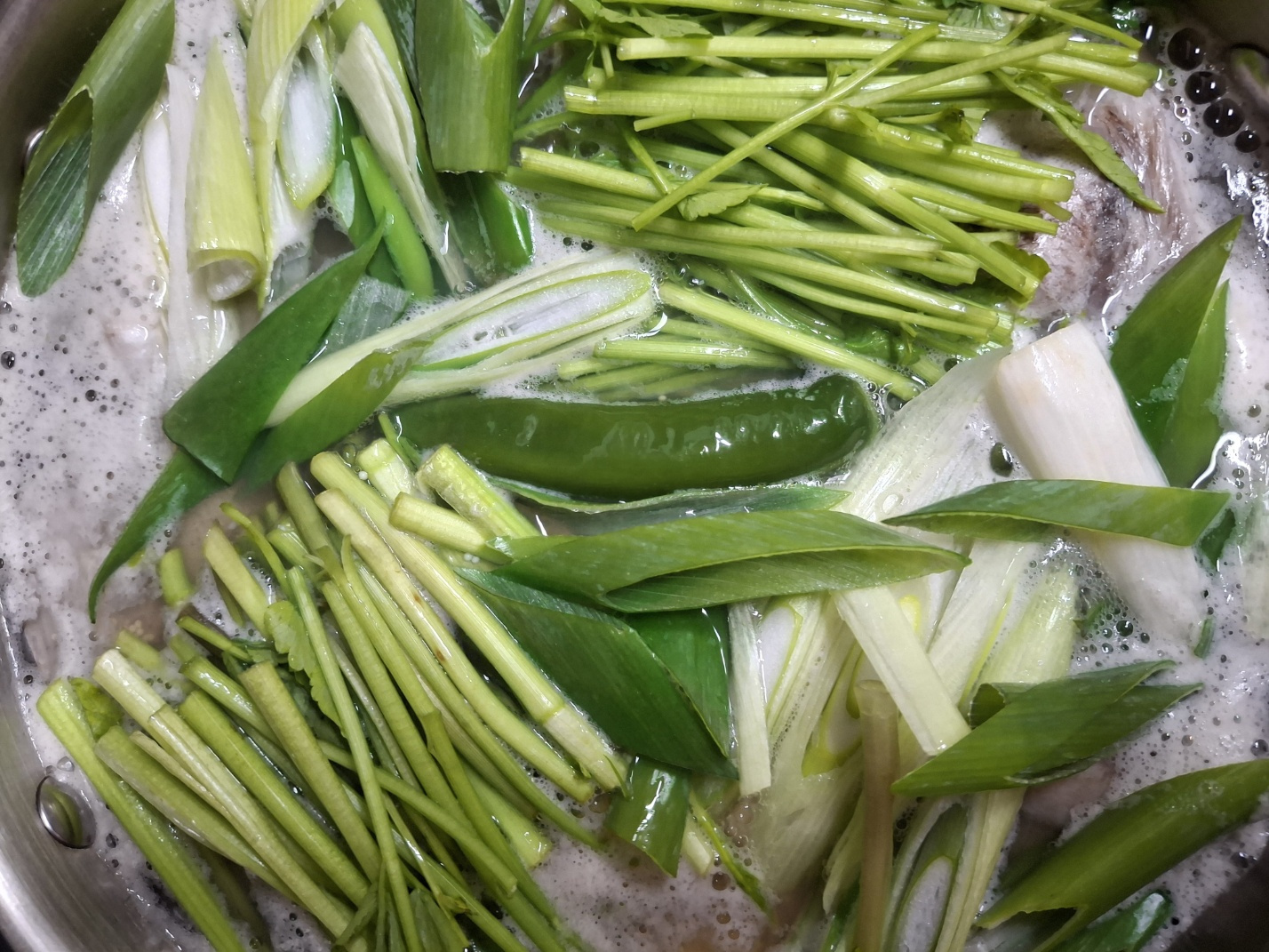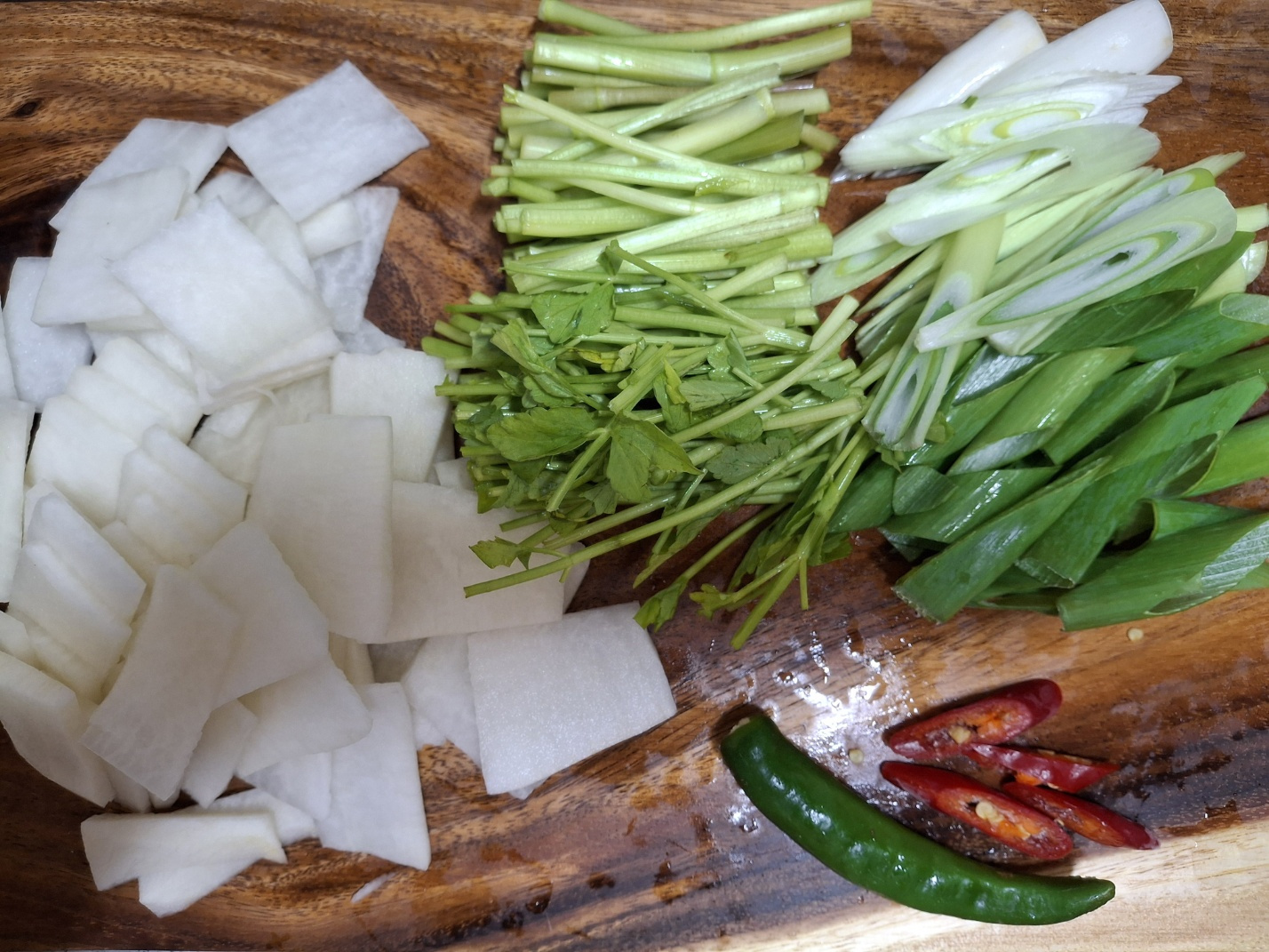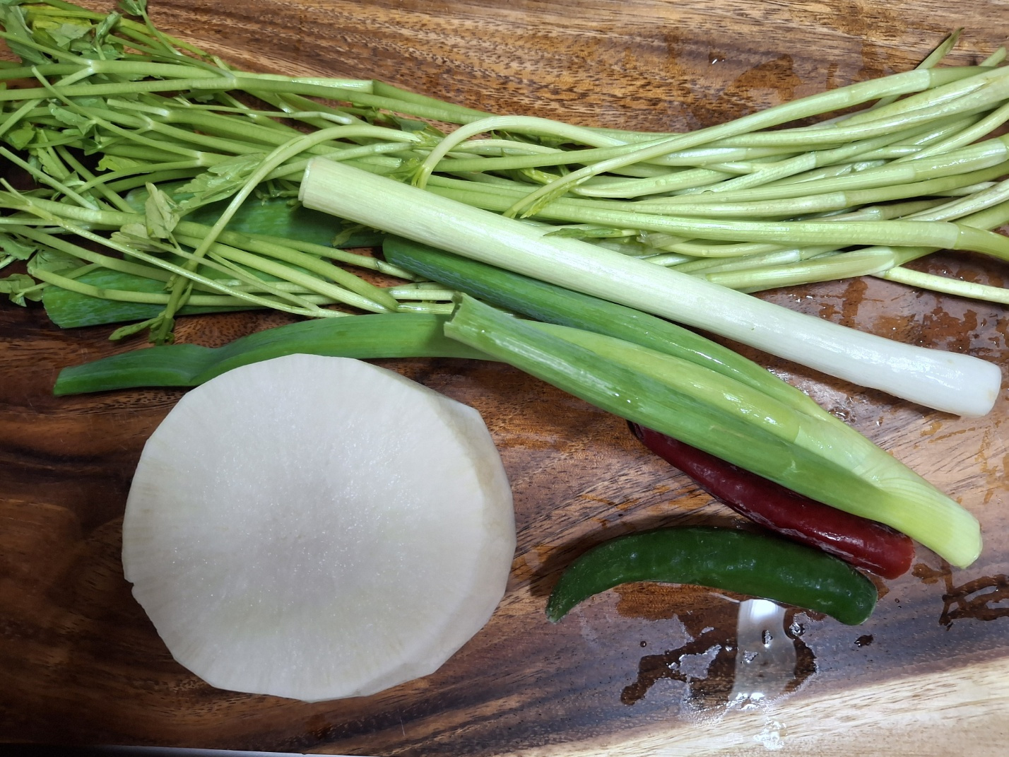 무 300g, 대파 1대, 미나리 100g, 청양고추 1개, 홍고추 1/2개