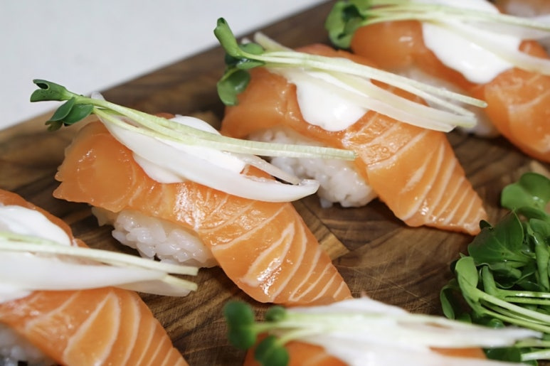 밥을 한입 크기로 가볍게 뭉쳐주고 슬라이스한 연어를 올려주세요. 저는 와사비는 따로 준비했어요. 취향에 따라 밥 위에 와사비 적당량, 그리고 연어를 올려주셔도 좋아요.