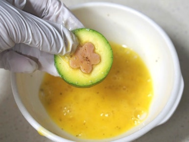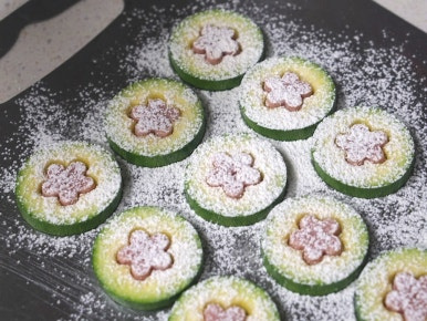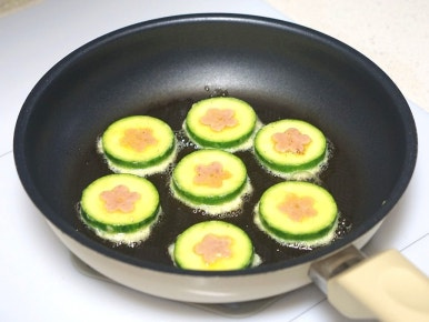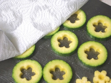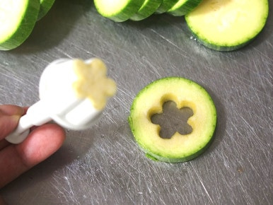애호박을 일정한 두께(약 7mm)로 잘라준 후 모양틀로 찍어 파내주세요. 그리고 호박에 소금을 소량 뿌려 10분간 두면 적당한 짠맛이 배어들어 전으로 부쳤을 때 맛이 훨씬 좋아요.