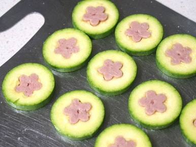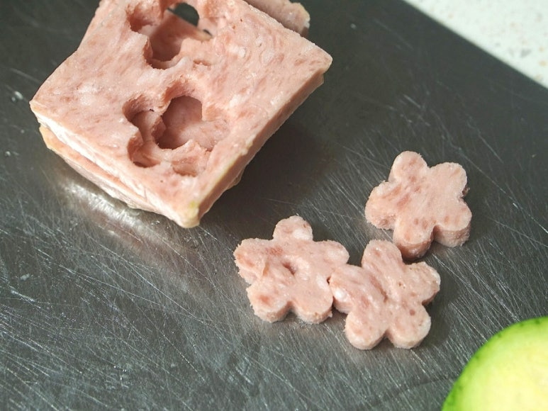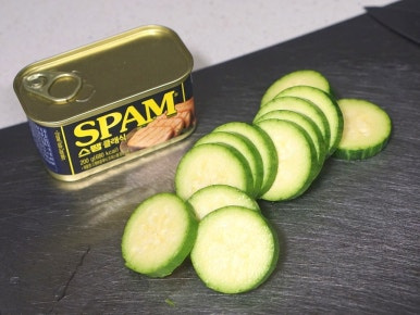 애호박에 소금 간이 배어들 동안 스팸의 속도 같은 모양틀로 파내주세요. 파낸 스팸은 뜨거운 물에 1분간 담가 첨가물을 제거해주세요.