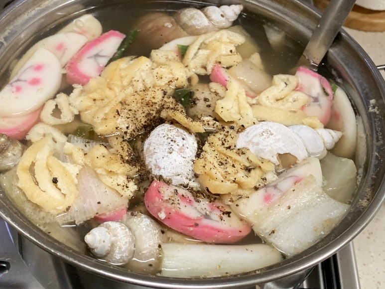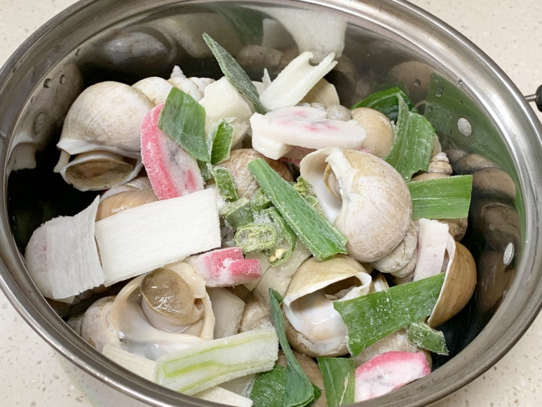 백골뱅이 1 kg , 무 3 cm토막 , 찐어묵 3 cm토막 , 청양고추 2 개 , 유부 2 개 , 쑥갓 6 줄기 , 가쓰오쯔유 3 큰술 , 후추 1 작은술 , 멸치다시마육수 1 알 , 해물육수 1 알 , 청주 2 큰술 , 다진마늘 1 큰술 , 다진생강 1 작은술 , 물 1 리터