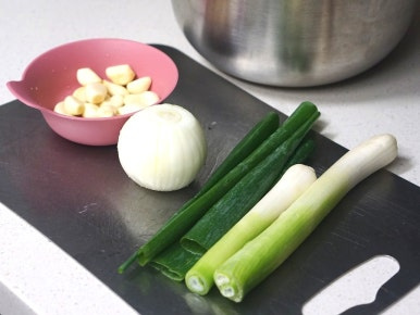 돼지 등갈비 600g , 대파 2대 , 양파 1개 , 통마늘 한줌 , 소금 3꼬집 , 오일 1바퀴
