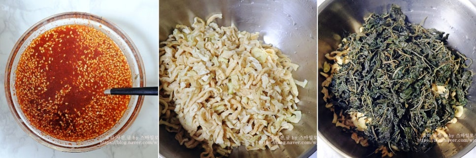 무말랭이와 고춧잎도 꼬들꼬들 잘 삶아져서 두 가지 재료를 준비해 놓았어요