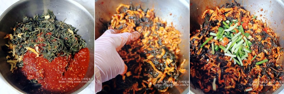 양념이 준비되었으면 무말랭이와 고춧잎을 넣고 훌훌 털어 고춧잎을 섞어줍니다