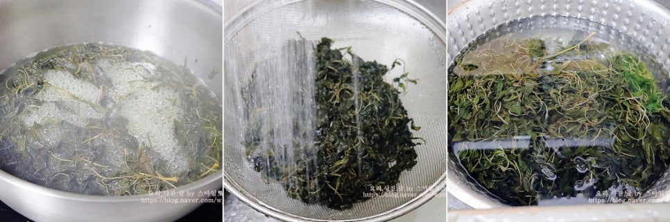 3분 정도 삶은 고춧잎은 흐르는 물에 열기를 식힌 후