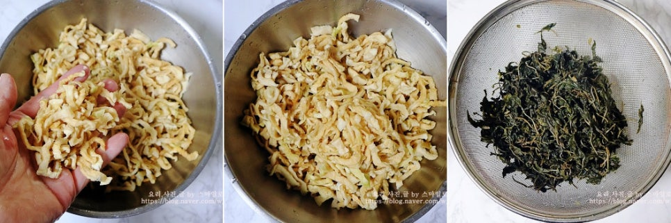 채반에 받쳐 물기를 뺀 무말랭이에 맛술이나 청주를 넣고 30분 정도 불려주는데요