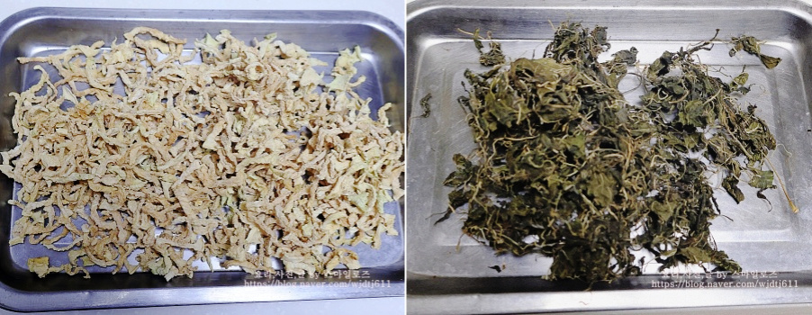 직접 식품 건조기에 말린 무말랭이와 고춧잎입니다