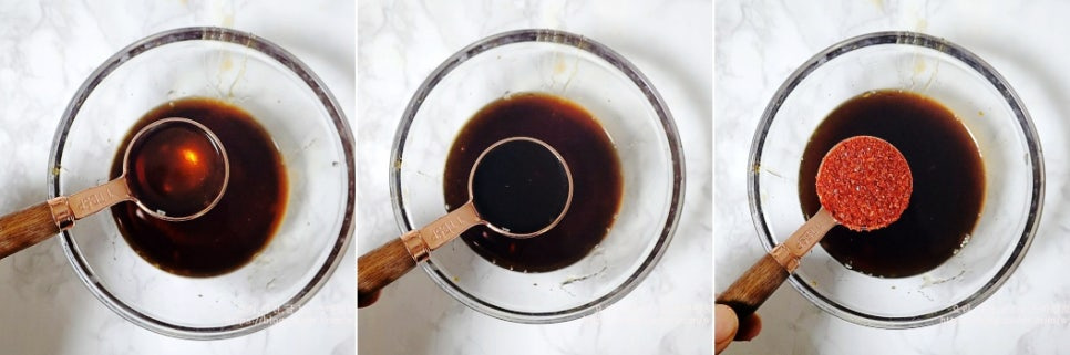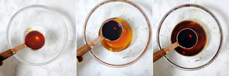 볼에 쌀 조청 8큰술(120ml)와 양조간장 3큰술 국간장 2큰술을 넣고