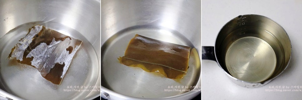 물 2컵에 다시마 큰 것 1장 넣고 끓이다가 끓기 시작하면