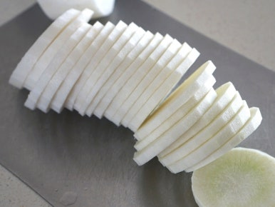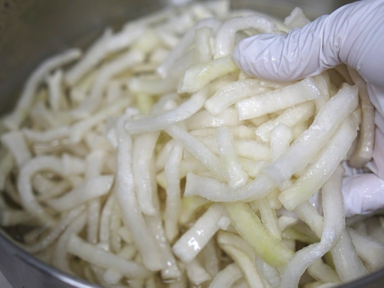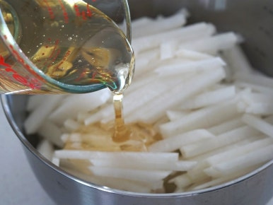 넓은 볼에 채 썬 무를 넣고 굵은소금 1.5T, 올리고당 300ml를 부어 고루 섞어주세요. 그리고 무에서 자연스러운 수분이 빠지고 단맛이 응축될 수 있도록 5~6시간 가량 절여주세요. 중간 중간 한 번씩 무를 뒤적여 골고루 절여질 수 있도록 해주세요.