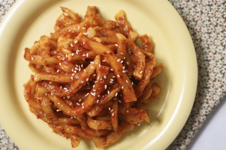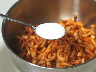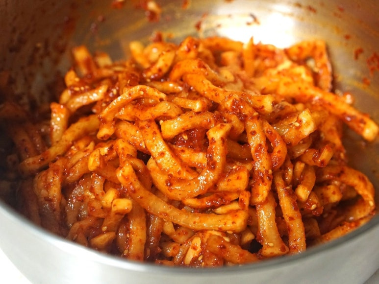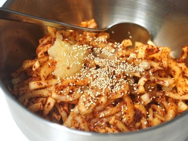 고춧가루 4T를 먼저 넣고 버무려 무에 색을 먼저 입혀준 후, 설탕 3T, 다진마늘 1T, 멸치액젓 4T, 올리고당 3T, 통깨 1T를 넣어 아래에서 위로 가볍게 들어 올리듯 버무려 주세요. 색이 고르게 입혀지면 맛을 보고 기호에 따라 액젓이나 고춧가루를 더해주셔도 좋아요.