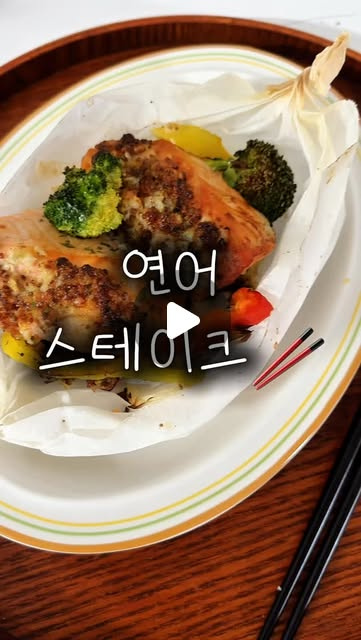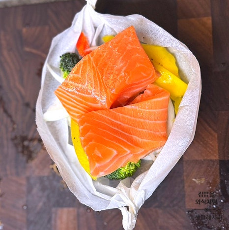 연어 두덩이 ( 200g ) , 양파 반개 , 파프리카 반개 , 브로콜리 3~4알( 야채는 취향껏 대체 가능 )