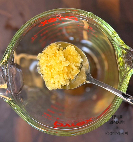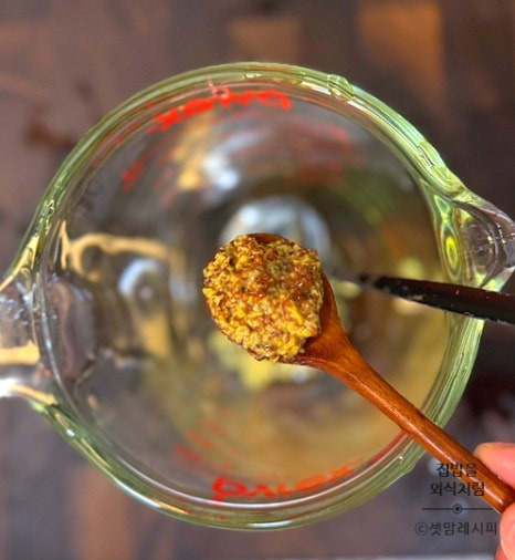 올리브유 2스푼 듬뿍 , 다진 마늘 1스푼 , 설탕 반 스푼 , 홀그레인 머스터드 반 스푼 , 소금 두 꼬집 , 후추 톡톡