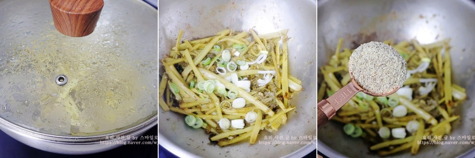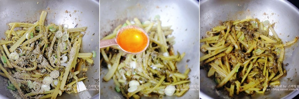 웍에 식용유 1큰술을 두르고 볶거나 저처럼 밑간해 놓은 시래기에